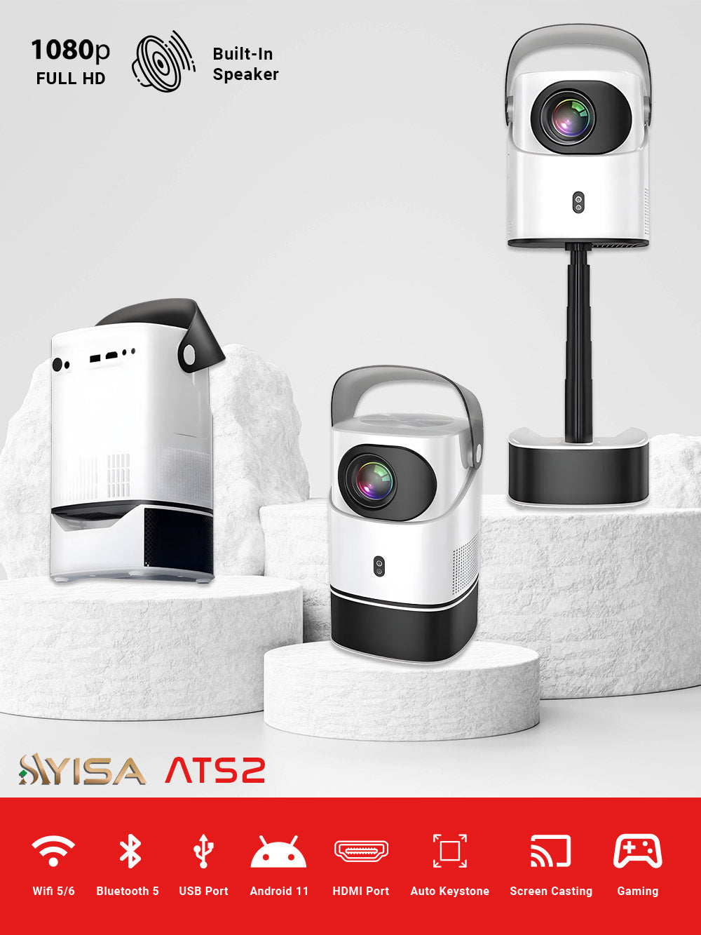 Ayisa Android Smart Projector ATS2, 1080P Full HD Portable Projector with Upgraded WiFi 5/6 and Gimbal, Compatible with TV Stick, Smartphone, HDMI, USB, Ideal for Indoor & Outdoor Use