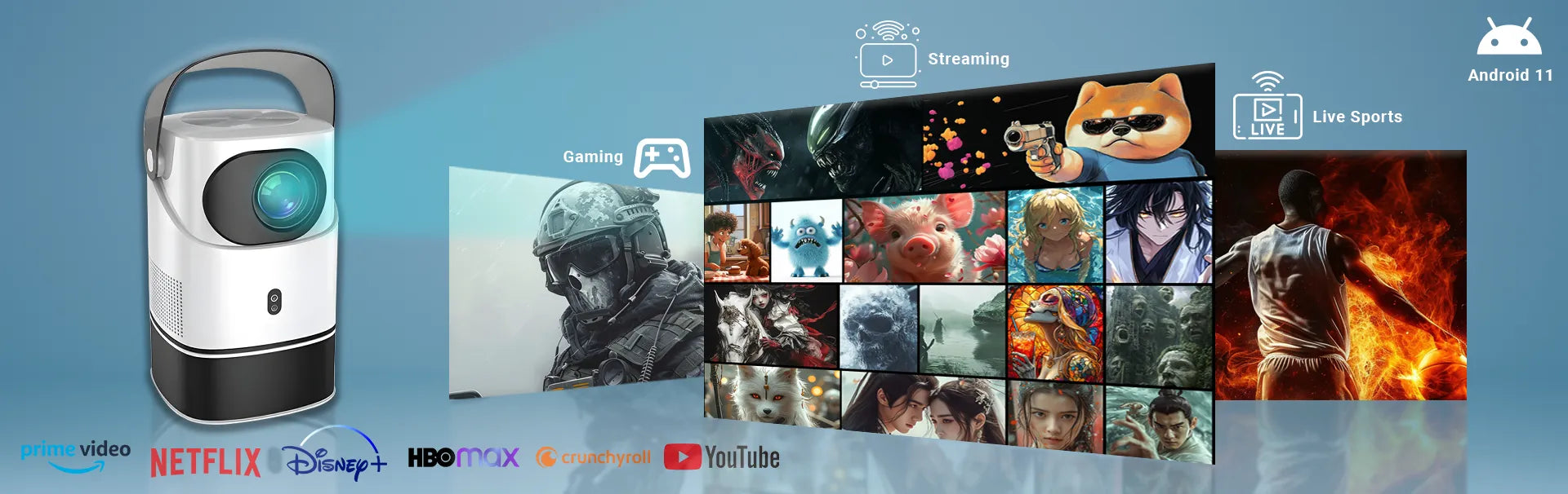 Equipped with WiFi 5/6, Bluetooth 5, HDMI, USB ports, and Android 11, this projector delivers exceptional performance in gaming, screen casting, and high-resolution viewing with auto keystone and built-in speakers.