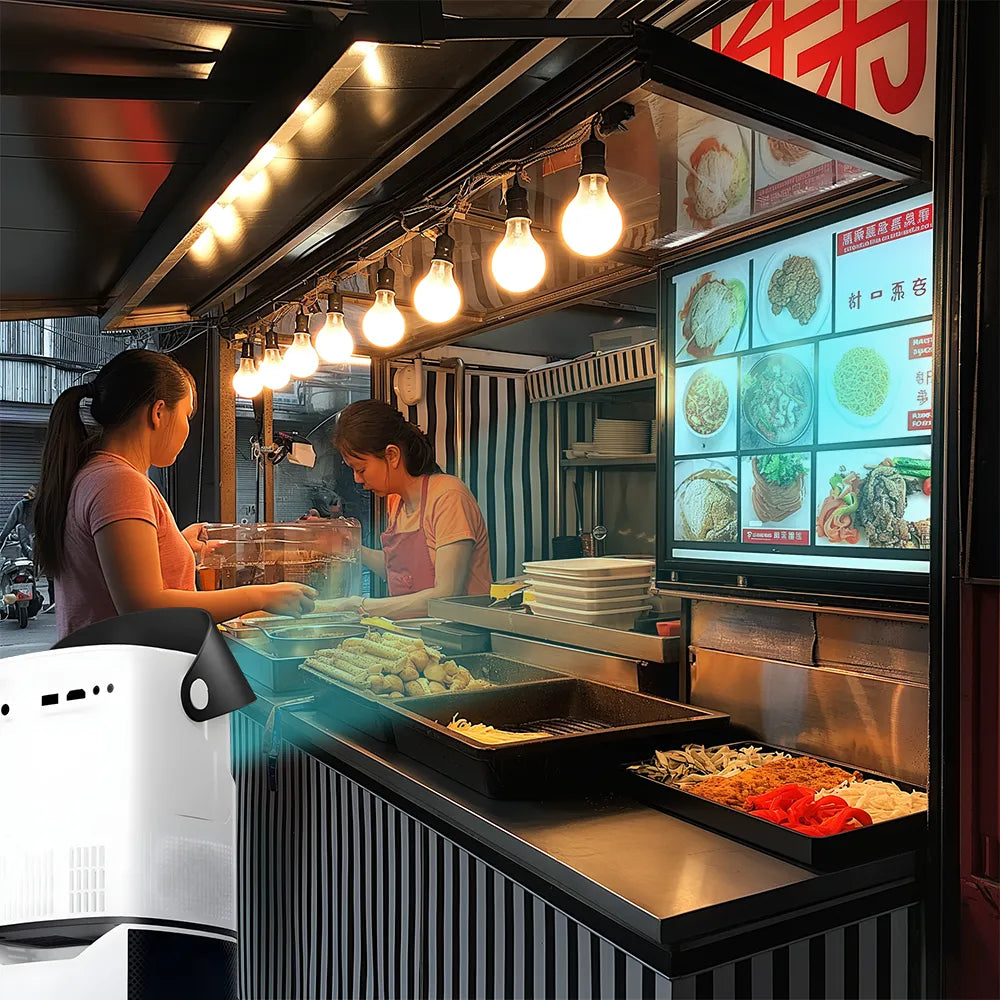 Turn heads and surprise your customers by projecting entertainment or your menu at your food stall with the Ayisa Projector—because who says fun can’t be found in the most unexpected places?