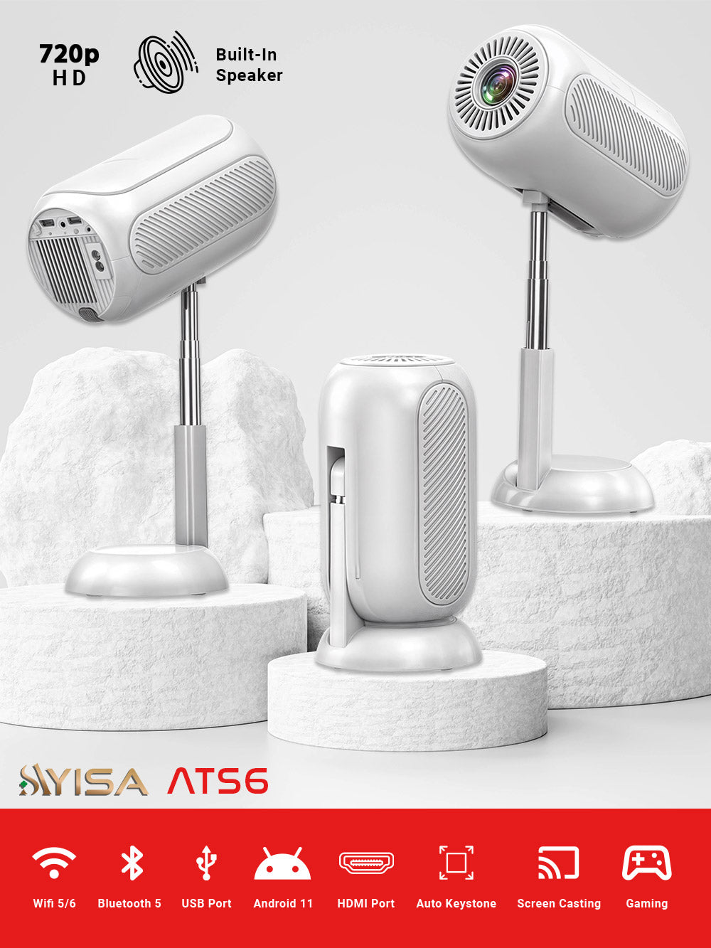 Ayisa Portable Android Smart Projector ATS6, 720P HD with Upgraded WiFi 5/6 and Built-In Gimbal, Connects to TV Stick, Smartphone, HDMI, USB, Suitable for Indoor & Outdoor Viewing