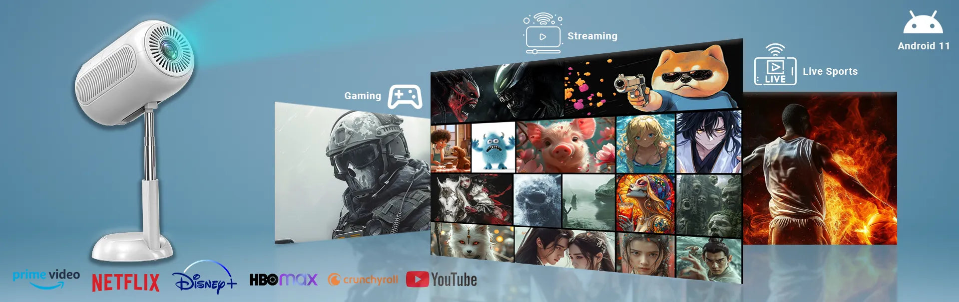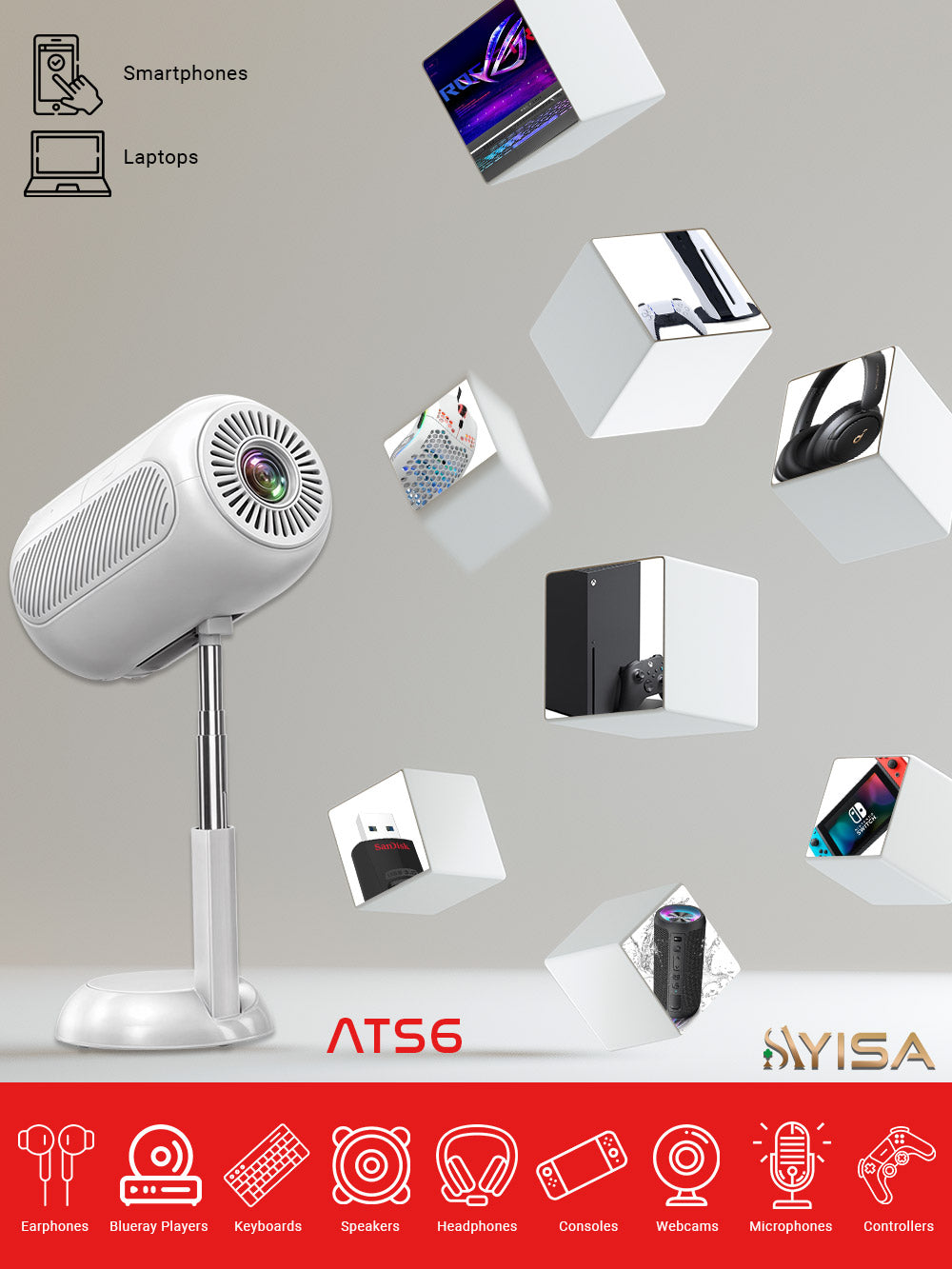 Transform your entertainment setup with the ATS6 Portable Android Projector, offering exceptional visuals, rich sound, integrated gimbal, and seamless connectivity no matter where you are.
